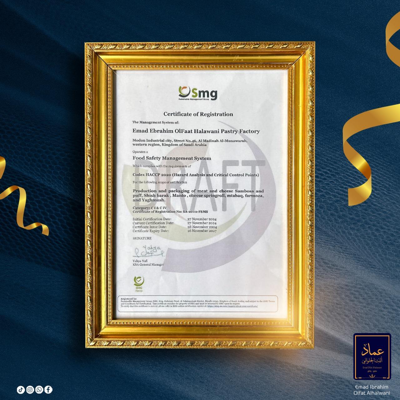 مؤسسة عماد الفت الحلواني , نعتز بتقديم تجربة طعام فريدة تمزج بين عبق الماضي ولمسات الحاضر . نستمد وصفاتنا من تراث الأجداد ونعيد تقديمها بجودة عالية وبأسلوب عصري يواكب تطلعات الذوق الحديث . نؤمن أن الأصالة لاتتغير , بل تتجدد , ولهذا نحرص على أن تكون كل وجبة نقدمها مزيجا من الطعم الأصيل والجودة التي تستحقونها وحصولنا على شهادة الجودة يعكس التزامنا المستمر بتقديم الأفضل والمحافظة على أعلى مستويات الأداء.